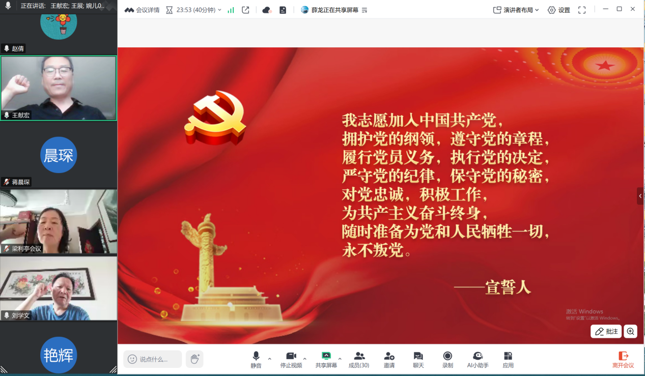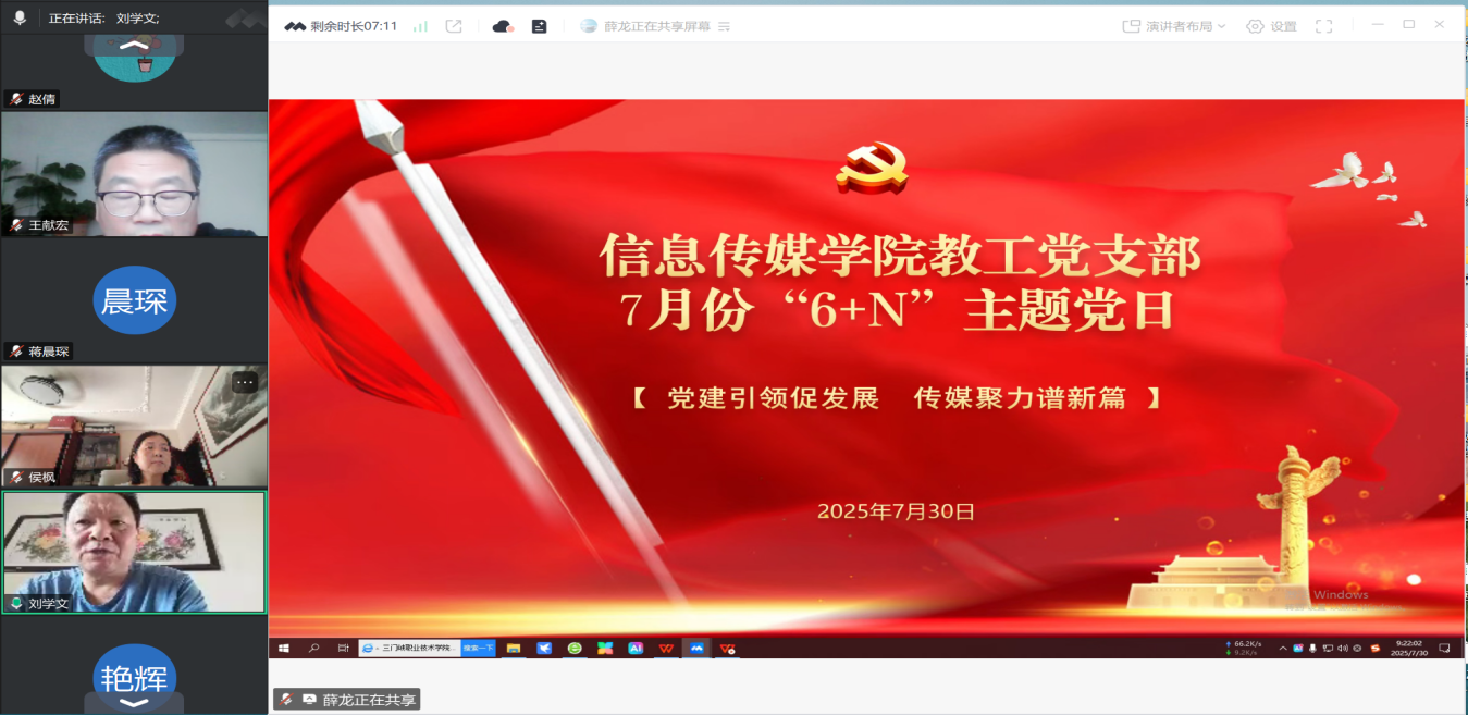 为庆祝中国共产党成立104周年,传承红色基因,凝聚奋进力量,7月30日上午九点,yl23411永利教工党支部在线上开展了“党建引领促发展,传媒聚力谱新篇”主题党日活动。通过“6+N”模式坚定理想信念,推动理论学习,展现新时代高校教师的责任与担当。会议由教工第二党支部书记薛龙主持,教工党支部全体党员参加。