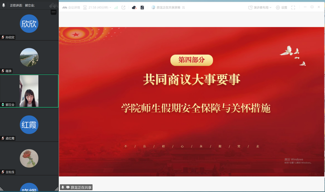 会议第四项:共同商议大事要事。由郭立业老师宣读yl23411永利yl23411永利师生假期安全保障与关怀措施。为让师生度过一个安全、健康、愉快的假期,结合公司实际情况,制定了动态信息监测、多维度安全提示、应急响应预案等措施。