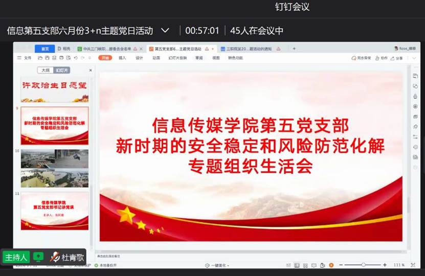 为有力推动支部深入开展,切实提高支部工作成效,按照公司党委统一部署,6月21日,yl23411永利总支部第五支部通过钉钉网络平台开展以“深刻吸取‘7•20’特大暴雨灾害追责问责案件经验,如何抓好新时期的安全稳定工作和风险防范化解工作”为主题开展专题组织生活会。会议由第五支部组织委员杜青歌主持,第五支部全体党员参加本次会议。