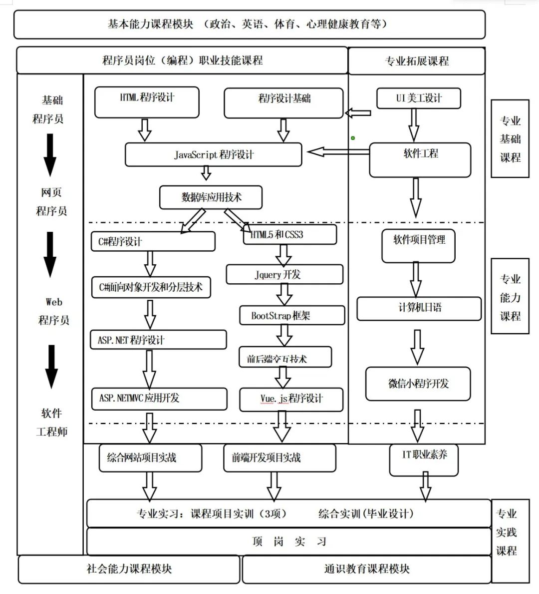 本专业课程体系是基于“软件程序员能力形成”和职业岗位能力要求构建的。以工作岗位中的工作任务作为划分课程的依据,根据软件开发过程为主线,以形成软件设计、前端开发、.NET程序设计等核心能力的课程为主干,将其软件技术职业岗位的课程不断融入主干课程之中,形成了基于能力形成的主干融入式的课程体系。