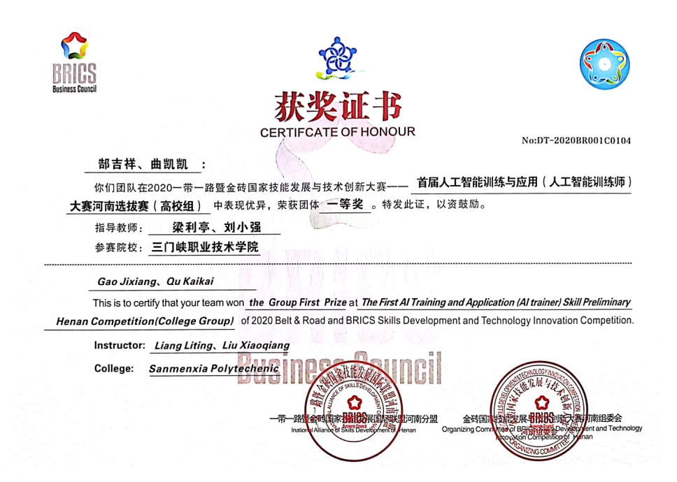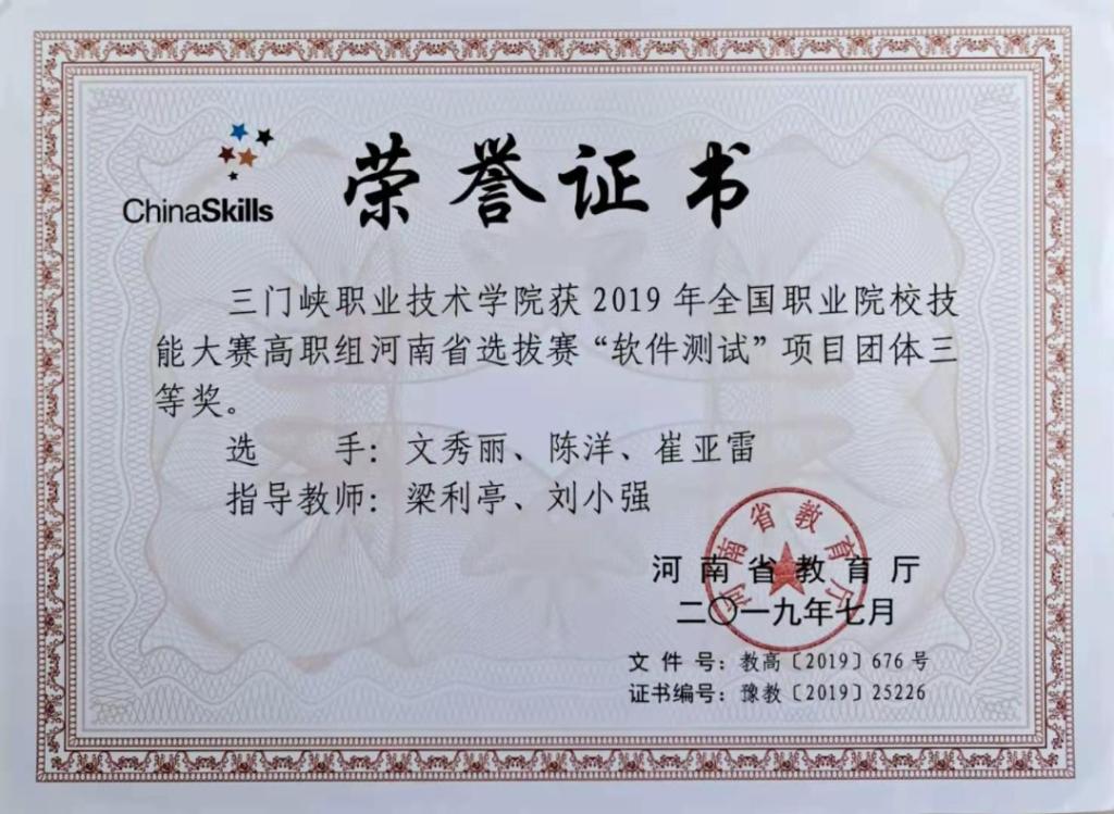 软件技术专业教师指导员工在各种技能大赛中屡次获奖,2020年指导员工参加“一带一路”暨金砖国家“人工智能训练与应用”河南选拔赛,获得团体一等奖;2018、2019年指导员工参加河南省职业技能大赛“软件测试”赛项,或三等奖;2014年,指导员工参加中国老员工计算机设计大赛,获得二等奖。