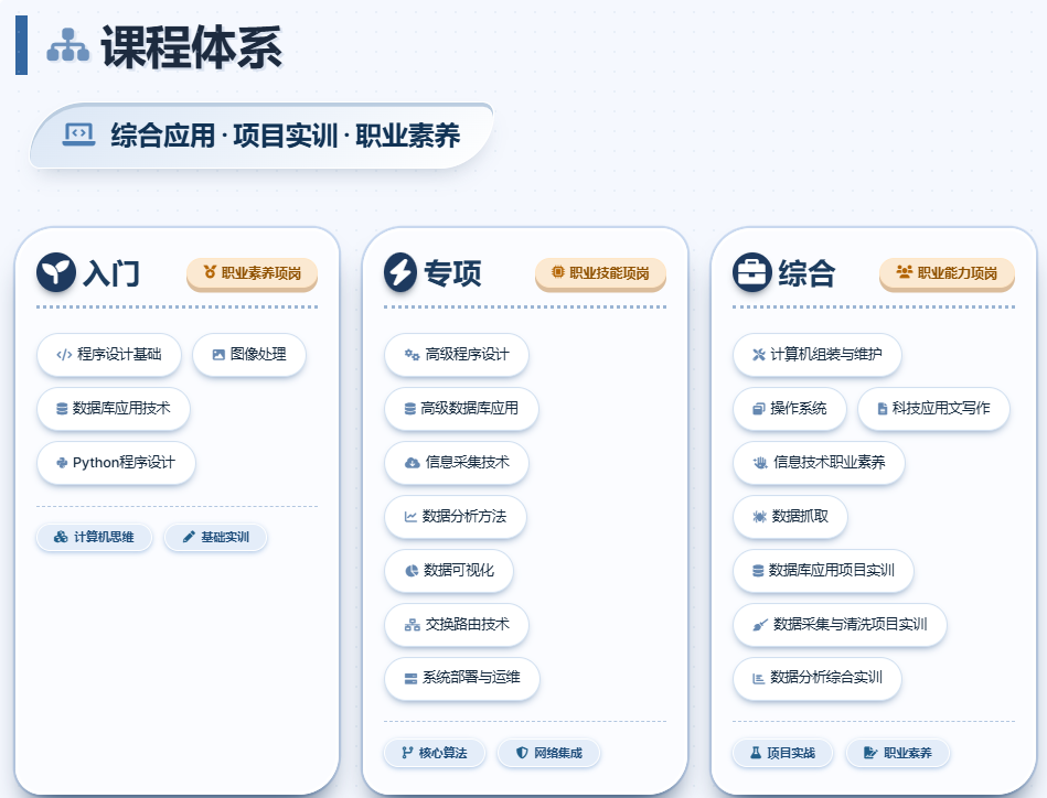 专业拓展课程:计算机组装与维护、操作系统、科技应用文写作、信息技术职业素养、数据抓取。